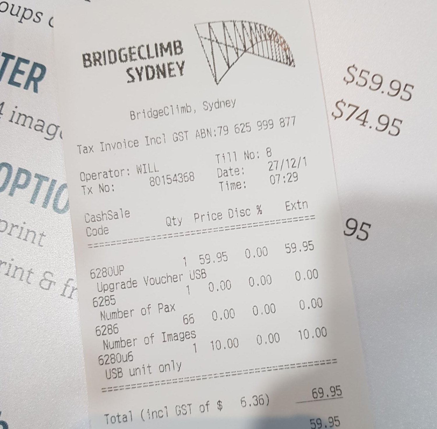 등반을 마치니 한 7시 반정도에 끝났다. 그룹 사진 1장은 프린트해서 무료로 나눠주고 이후 개인사진을 보고 다 구매할 건지, USB에 파일을 담을 건지, 특정 사진을 출력하기를 원하는지 등등에 대해서 데스크에 문의하면 프로그램이 완전히 끝난다. 사진을 보고 퀄리티에 경악했지만 기념이라서 어쩔 수 없었다. 가격표는 아래 그림 참조. 내가 나온 사진들만 넣어주려고 하길래, 풍경만 찍어둔 사진들도 전부 넣어달라고 했더니 13장에서 60여 장으로 확 늘어났다. 5만원 내는데 다 해줘야지 암. 일출이라서 장점이었던 점은 우리가 갓 나왔을 땐 깜깜한 상태의 풍경사진도 얻을 수 있고 일몰일 때의 느낌과 해 뜨고 나서의 풍경사진 등 시드니의 다채로운 면을 받아볼 수 있단 점이다. 그런데 막상 한국 귀국해서 파일 딱 열어보니 워터마크 너무 커서 그건 좀 화남. 기념이긴 한데 말이야 너무 커