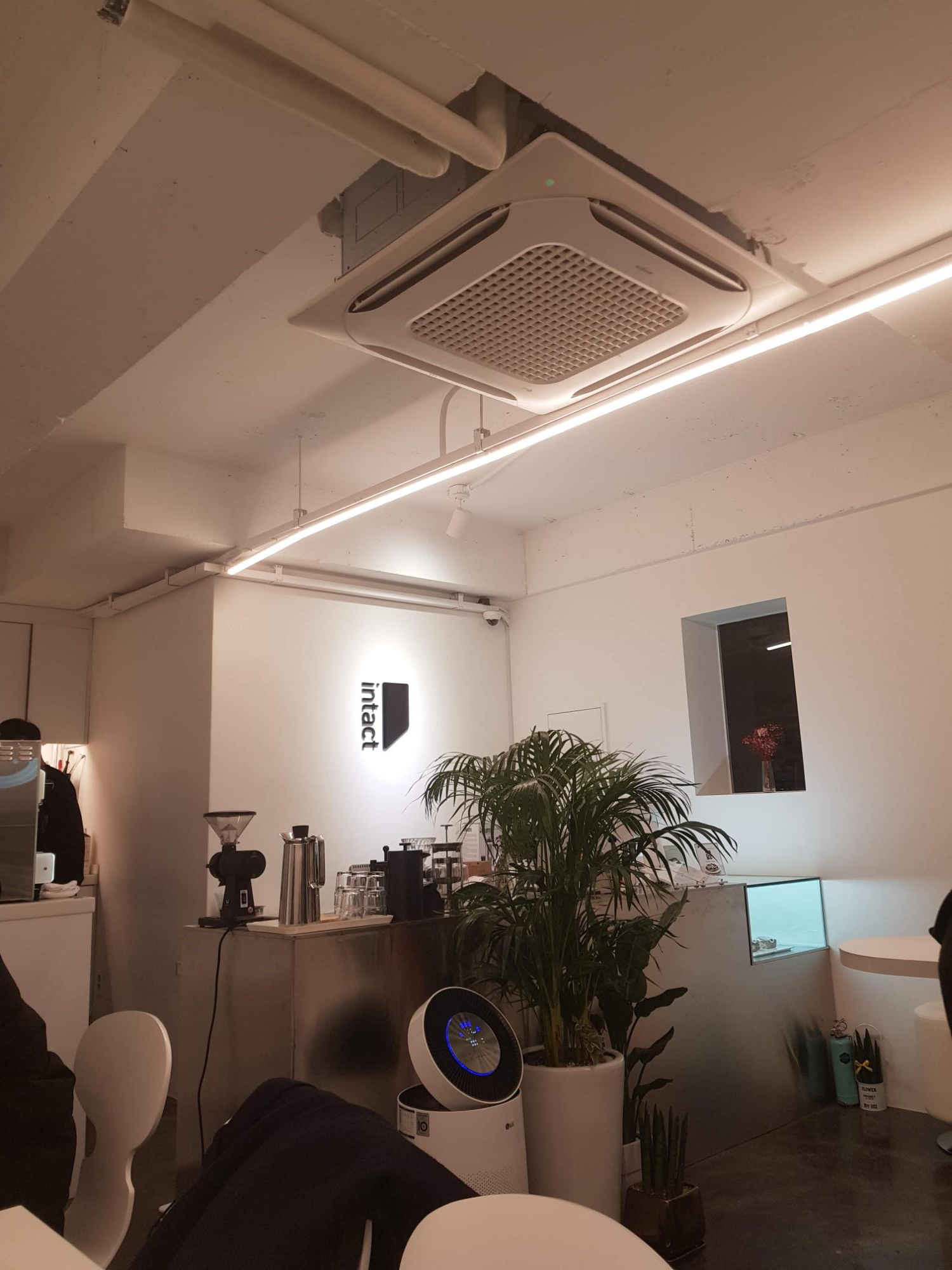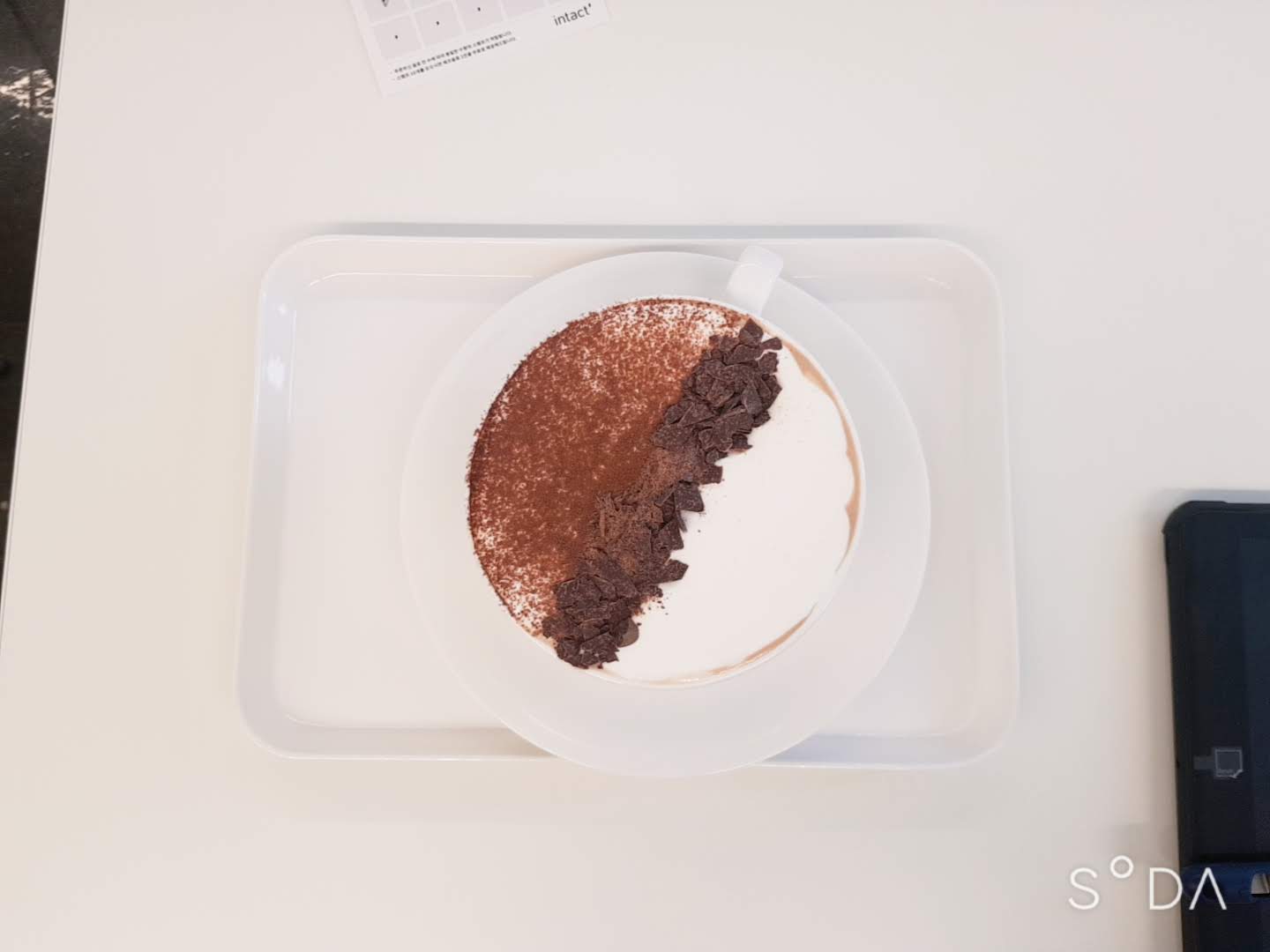여기 시그니처가 뭔지 봤는데 가게 이름과 같은 커피인 intact coffee(5,200원)를 팔고 있길래 마셨다. 아인슈페너에다가 초코 가루를 끼얹고 가운데는 자바칩 초코를 반 잘라서 올려둔 것이라고 생각하면 편하다. 주인 분께서 가니쉬 스타일로 뭔가 하신다그랬는데 자리에 앉으면서 그사이에 까먹었다. 아이리쉬 커피에 술 대신 초코 끼얹은 느낌이었다.